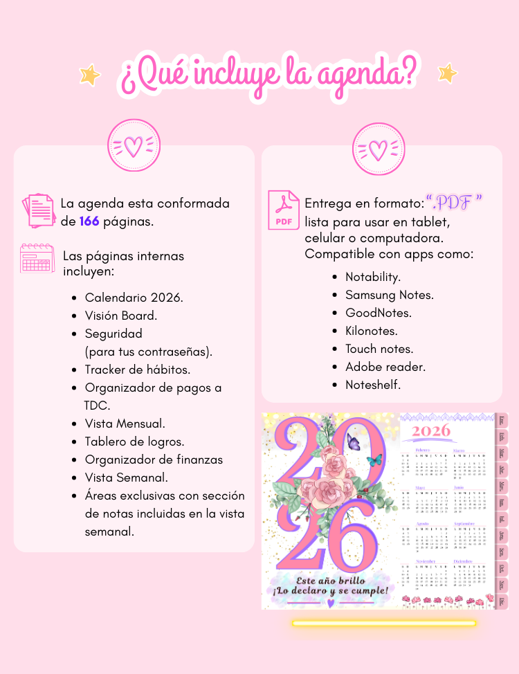 4. ENTREGA DEL PRODUCTO DIGITAL: Una vez entregada la “Agenda Digital 2026” deberás asegurarte de poder descargarla en PDF ya que al pasar 2 días sin comentario alguno se tomará dicho pedido como ENTREGADO.